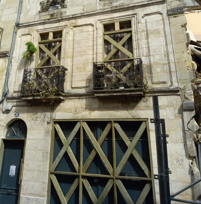 Le chevalet en bois destiné à soutenir la façade du 22 rue Planterose restera en place jusqu’à la fin des interventions de sécurisation, de confortement et de reprise.