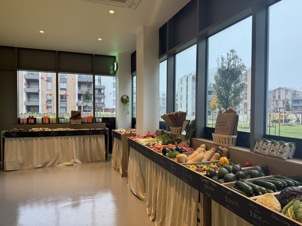 La boutique est assez spacieuse avec la majorité des meubles et des étalages qui ont été fabriqués maison. Elle offre de grandes baies vitrées assez lumineuses pour éclairer tous nos fruits et légumes. On a installé au centre une belle vitrine à fromage qui permet de donner un petit élan à ce magasin. Et puis il y a aussi le côté épicerie fine avec de beaux jus, des soupes et plein de petits plats, bocaux, etc.