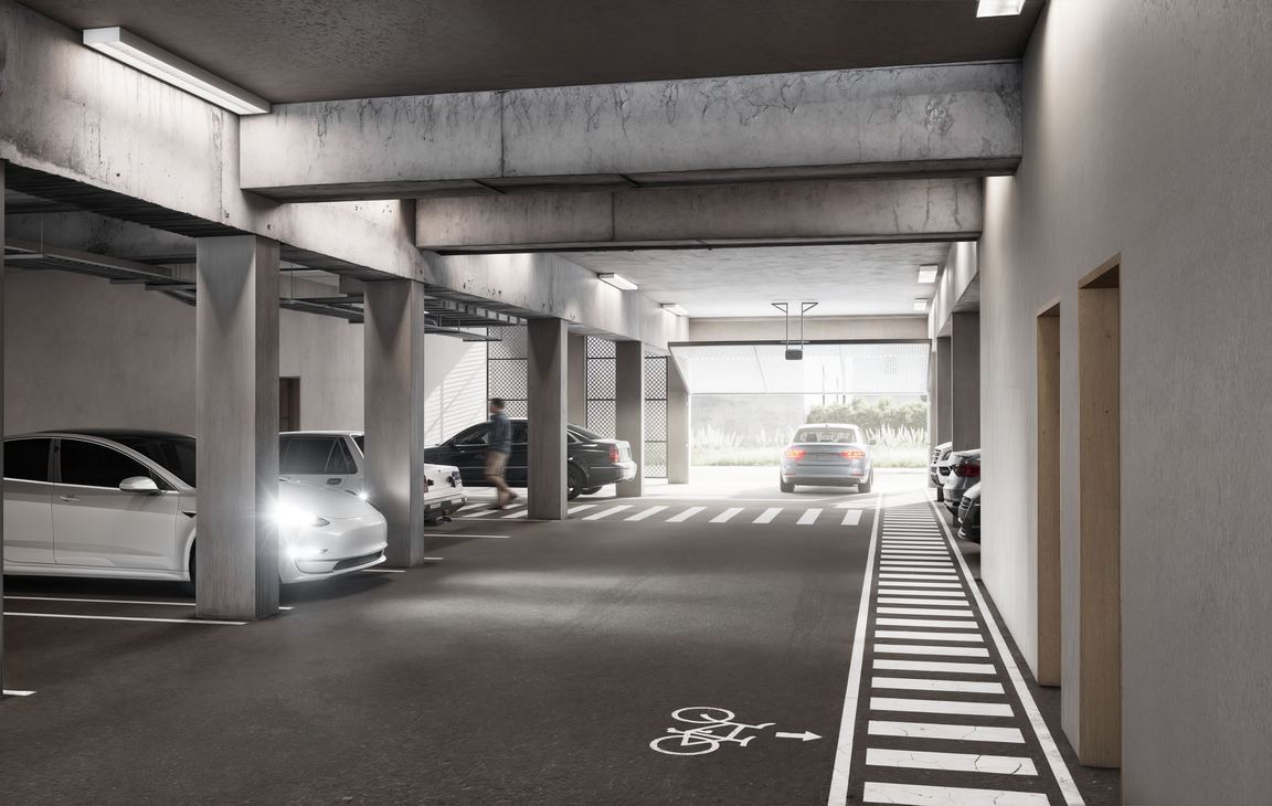 • En rez-de-chaussée : parking de livraison de 18 m x 3.5 m avec dispositif de livraison directe aux coursives des étages depuis la rue ; 17 places de stationnement en parking collectif fermé avec porte basculante motorisée; local vélos de 33 m² fermé ; 3 boxes individuels.